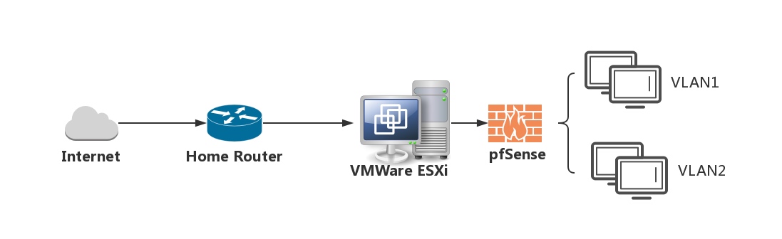 实际上这就是上面的第三种方式了,将VLan ID设置为4095之后,在虚拟交换这层做任何Vlan划分之后,都可以直接联通ID为4095区域下的虚拟机了(这里为pfSense),换到这里来说就是从家庭路由之后,先接入pfSense,再通过pfSense做规则来访问相对应的不同Vlan,这也就保证隔离了家庭路由与虚拟机直接的网络访问,能够很好的在家庭路由下(你自己的内网中)模拟内外网的情况。