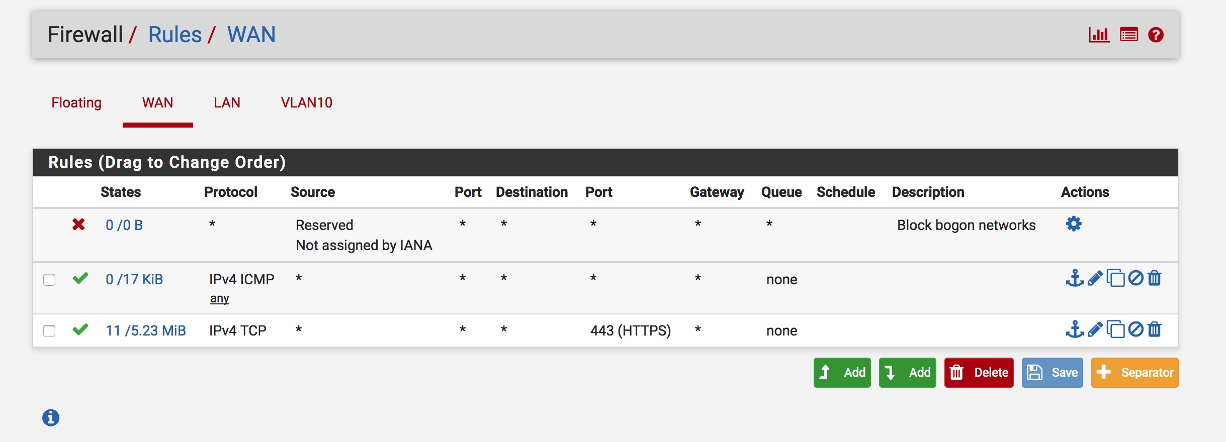 安装pfSense时,我们需要先设置两张网卡,一张用于WAN口接入,一张用于LAN口(assign VLAN用)。快速安装完成之后,需要首先确认Interface是否正确,我们的目标是需要能通过Wan口访问到pfSense的Web管理界面。在ESXi的pfSense虚拟机控制台中,我们按8得到Shell,使用pfctl -d临时禁用防火墙规则,以便从Wan访问到pfSense的Web管理端,随后我们可以在 Firewall/Rules/WAN 添加对应规则: