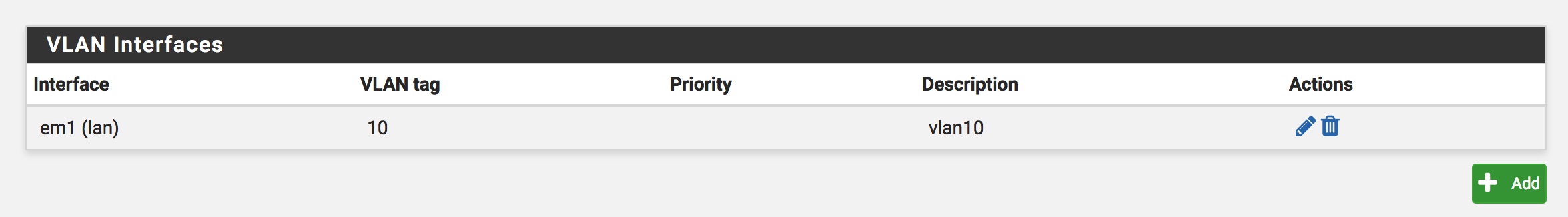 同时我们需要在 vSwitch 下的 PortGroup 中新建一个端口组,我这里定为Vlan10且其VLAN ID为10在后面安装虚拟机时候,我们的网卡设定可以关联VLan10即可。同时在pfSense中的 Interfaces/VLANs 也新建一个VLan如下,Tag与vSwitch中新建的端口组VLanID相对应