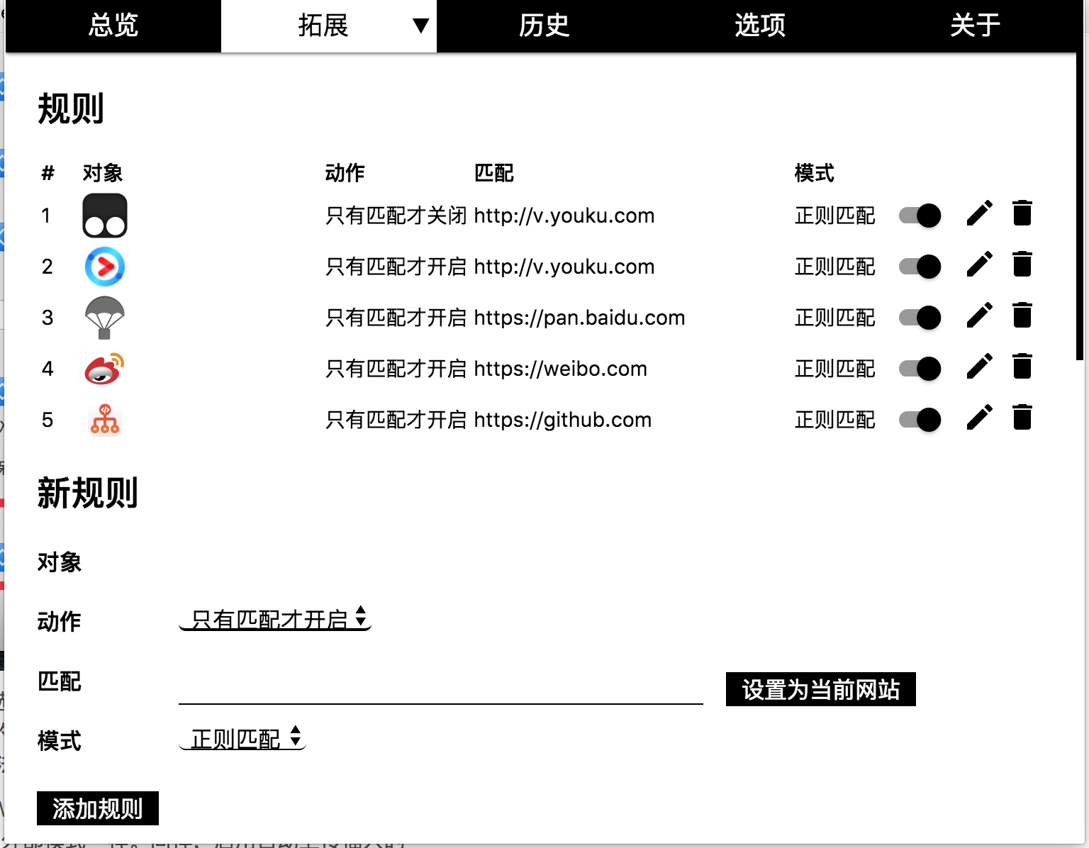这样以来看起来似乎有些不太优雅,驱动油猴脚本我使用的TemperMonkey,害怕插件之间互有冲突怎么办? 这个时候,又要推荐第二位出场的国人作品的插件“二管家” ,其拥有的插件自动管理功能可以根据使用场景(匹配域名等)进行开启和关闭等操作。