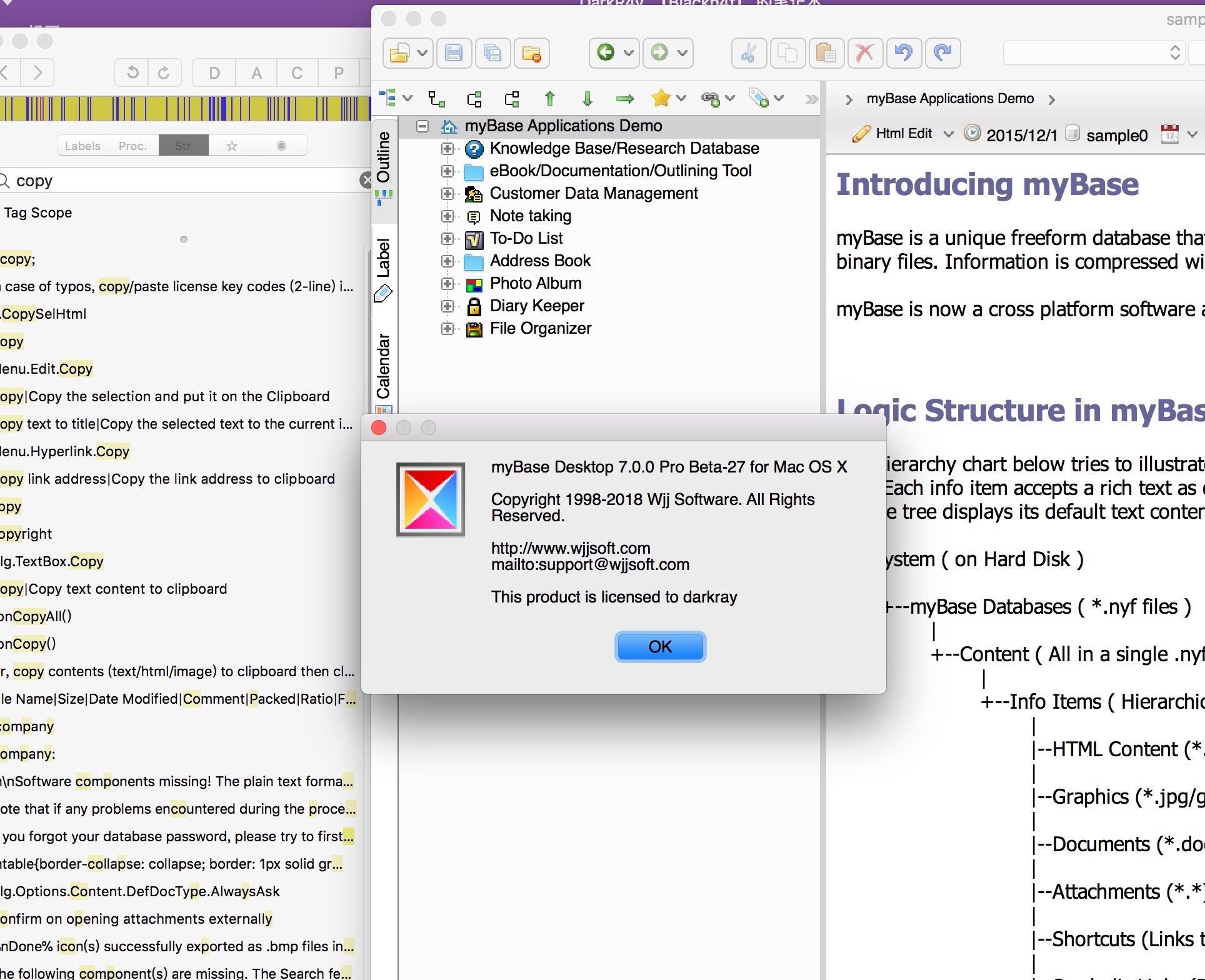 下载好之后解压到 /Application/myBase.app ,打开体验下功能。非注册版的限制主要在时间上,过了试用时间后则无法使用,所以第一个想到的破解方式就是Patch时间限制达到无限试用。点击了菜单中的Register随意输入几个注册码弹出无效注册码提示( 此时最好将 /Application/myBase.app/Content/MacOS/lang/ 下的chs.ini暂时改名,以便于直接查看弹出的英文提示框,便于后面分析 ),到这里能想到的第二个方法就是经典的字符串搜索加爆破大法了。